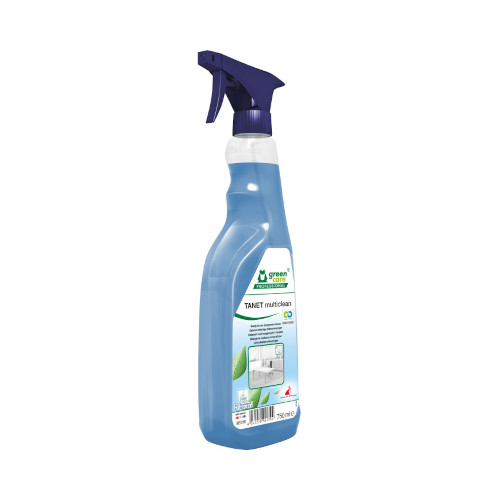 Green Care Tanet Multiclean is een gebruiksklare allesreiniger in een sprayflacon. Deze veelzijdige allesreiniger verwijdert alle soorten vuil zoals vingerafdrukken, nicotineresten, vet-en inktvlekken en balpen-en stiftstrepen van alle afwasbare, gladde en glanzende oppervlakken. De sneldrogende formule maakt de oppervlakken glanzend en snel weer bruikbaar. Tanet Multiclean is materiaalvriendelijk en laat een langdurig aangename geur na.